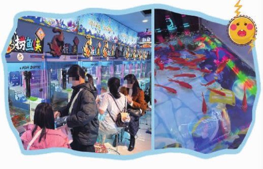 在该商场负二楼,一家主打捞鱼项目的“捞鱼侠”店内,摆放了近40台类似的捞鱼电玩设备,每台设备内约有40条鱼。消费者捞获的鱼可统一放置在桶中,可带走,也可以在前台机器内回收计算积分,兑换其他品类的鱼以及荷兰猪、兔子、乌龟和蜥蜴等多种活体宠物。