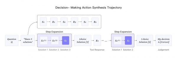 动作合成基于多风格问题和历史轨迹数据,我们分别构建了三种类型的动作数据,包含规划、推理和决策动作。我们的方法能够在离线环境下大规模、全面地探索潜在的推理-动作空间,从而消除了对额外商业工具 API 调用的需求。特别地,对于决策动作合成,我们将原始轨迹建模成多步骤决策过程,以激发模型的探索能力和决策能力。