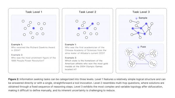 构建复杂知识图谱:从真实世界的网站出发,通过随机游走的方式,构建出一个包含大量实体和复杂关系的高度互联的知识图谱。这保证了问题的源头是真实的,结构是非线性的。采样+提问:从这个复杂的图中,随机采样出一个子图,然后基于这个子图生成问题和答案。制造难度(关键步骤):在生成问题时,故意对信息进行模糊化处理。