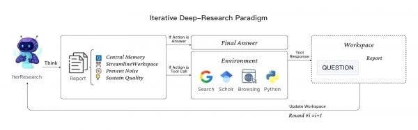 我们提出了“迭代式深度研究范式” (Iterative Deep-Research Paradigm) 。核心思想是,用一系列“综合与重构”的动态循环,取代单一、无限膨胀的上下文。