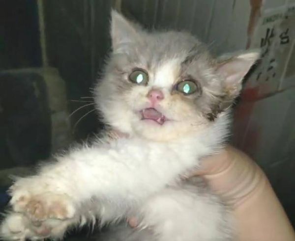 隔天,铲屎官带着小猫去了宠物医院,检查发现,这只小奶有有严重的猫藓和耳螨,眼睛还有炎症,身上还带着伤。