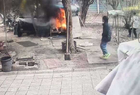 监控视频显示,监控时间1日中午12时34分50秒左右,两个男孩来到狗笼外,其中一个男孩将点燃的烟花扔进狗笼,很快笼内有轻烟飘出,两个男孩跑开。12时35分40秒左右,两个男孩再次来到狗笼外,共同点燃一支烟花,这时狗笼内的烟稍大,他们观望后没有再将烟花扔进笼内。随后,黑衣男孩开始拿着烟花去追一只鸡,白衣男孩在狗笼外观察后大叫“着火了”。12时37分,狗笼内开始有浓烈的黑烟升起,不久烈火将笼子吞噬,视频中能听到狗狗的惨叫。