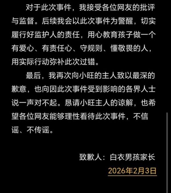 2月3日凌晨,白衣男孩的家长陈先生(化姓)在视频平台发布了道歉视频,以及自己的道歉信。其在信中表示,1日事发后他接到派出所通知,便第一时间赶到调解室配合处理。经调解,两家家长与萨摩耶小旺的主人达成一致,各赔偿3000元(共6000元),当场完成转账,并签订了调解协议。两家家长和孩子,也向狗主人表达了歉意。