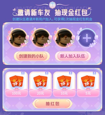 福利当然要和好友一起分享!老玩家可创建小队,邀请新用户加入队伍,即可获得现金红包抽奖机会。奖池内含多档现金奖励,邀请好友一起飙车,既能并肩作战,又能抽取红包,快乐与福利双丰收。