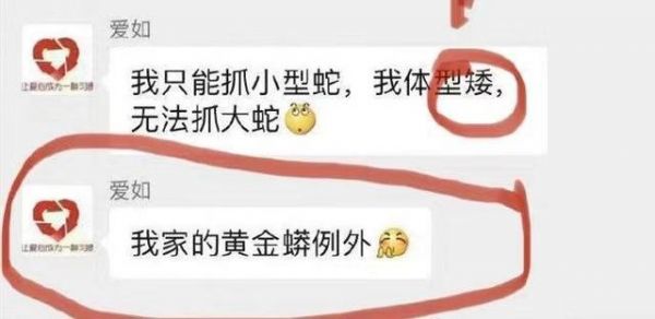 在一次微信群聊中,“爱如”无意中透露,自家养有一条黄金蟒。网传聊天记录显示,“爱如”在一个微信群里说“我只能抓小型蛇,我体型矮,无法抓大蛇,我家的黄金蟒例外”。