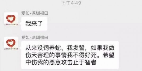根据网帖中的一张截图,“爱如”曾在一个微信群对此事正面回应称,“从来没饲养蛇,我发誓,如果我做伤天害理的事情我不得好死,希望中伤我的恶意攻击止于智者”。