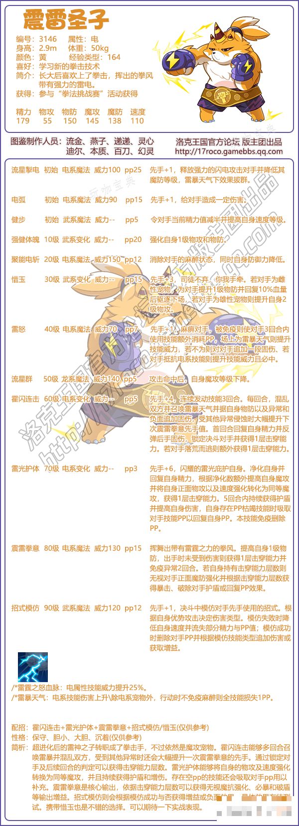 1、《洛克王国》震雷圣子技能配招:霍闪连击+雷光护体+震雷拳意+招式模仿/惜玉
