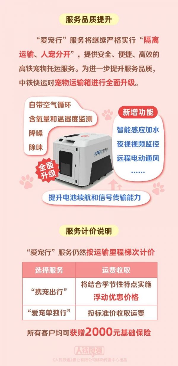 在深入总结试行经验的基础上,铁路部门广泛听取旅客意见,坚持以市场需求为导向,充分利用高铁动车组和中铁快运网点资源,进一步优化高铁宠物托运产品,丰富服务场景,提升运营品质,推出“爱宠行”服务,提供“携宠出行”与“爱宠单独行”两种托运模式,为旅客提供更多选择。