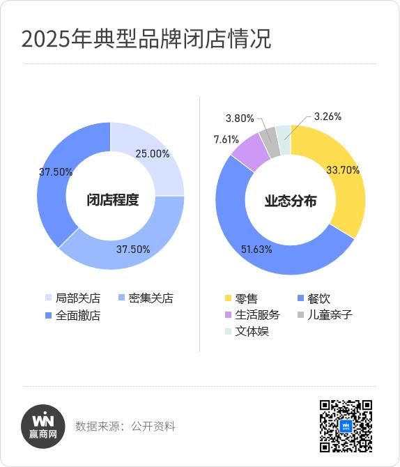 据赢商网不完全统计,2025全年国内有超180个典型品牌进行闭店动作,累计关店超15000家。其中,餐饮闭店品牌占比最高,超50%;发生密集关店以及全面撤店的品牌占比近八成。