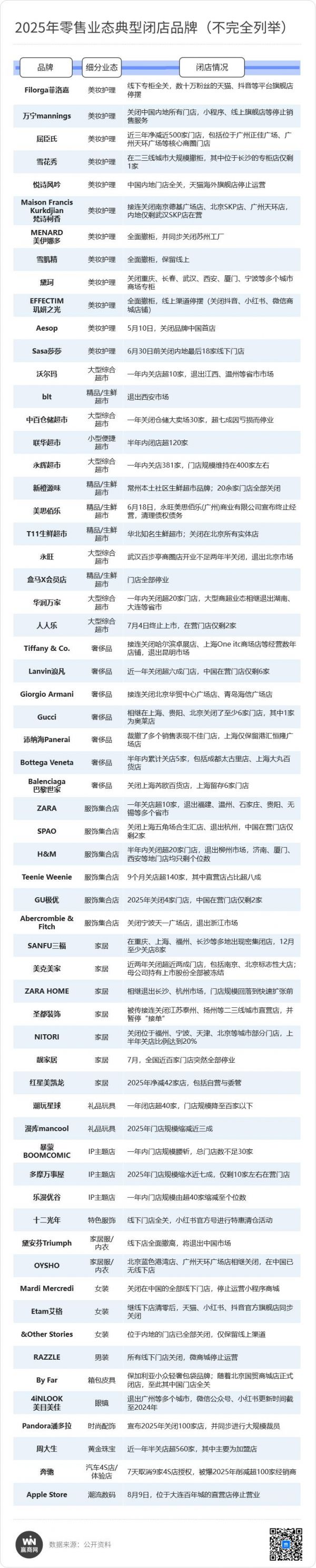 据赢商网不完全统计,2025年超60家零售连锁品牌发生闭店动作,以商超、美妆护理、奢侈品、服饰集合店为主,大众化及中档品牌占比超63%。