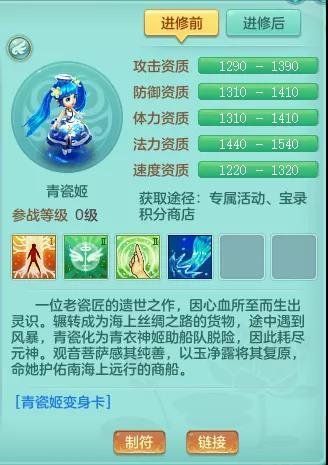 另外,青瓷姬的资质技能并不是一成不变的,它会随着玩家一同成长。玩家在获取"青瓷姬"后可以通过活跃度人物来获得3个青瓷资质丹,到了30级之后,玩家还可以在宝录积分商店,通过宝录积分继续兑换剩下的7个青瓷资质丹。每个资质丹可以使青瓷姬的全部资质提升10点。玩家在等级达到40、60、75级后可分别对"青瓷姬"使用3、5、2个青瓷资质丹,让她的整体资质累积提升100点,如果要追求极致,也可以通过佩戴双饰品来让她的资质再提高35点。