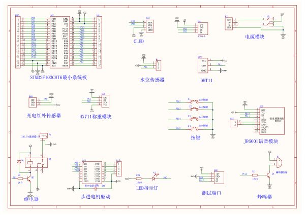 温湿度采集:DHT11检测宠物窝的温湿度。宠物靠近检测:光电红外传感器检测是否有宠物靠近。重量检测:HX711称重模块检测投喂食物的重量水位检测:通过水位传感器检测喂水水位屏幕显示:OLED屏实时显示当前时间、宠物窝的温度、湿度,食物重量和水位。投喂控制:步进电机模拟进行喂食控制自动模式:达到定时时间后开启自动喂食同时扬声器播报语音并伴随蜂鸣器提醒,喂食后重量达到设定值再返回结束喂食;当宠物靠近且水位低于阈值时候自动喂水手动模式:手动模式下通过按键可控制喂食和喂水的开关功能模式切换:按键可切换自动模式和手动模式阈值调节:按键可设置当前时间、3个定时喂食的时间、食物重量阈值和水位阈值手机APP:通过蓝牙连接手机APP可接收当前环境信息数据,可切换模式和完成控制指令下发 2.主要器件 STM32F103C8T6单片机DHT11温湿度传感器OLED 屏幕HX711称重模块光电红外传感器BT04A(蓝牙)LED灯步进电机ULN2003步进电机驱动芯片JR6001语音模块水位传感器有源蜂鸣器扬声器继电器水泵