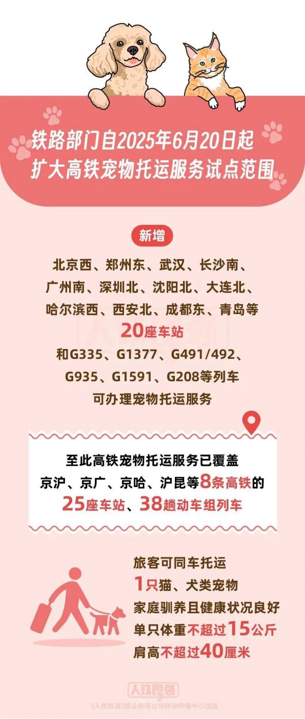 铁路部门在深入总结试点经验的基础上,决定自2025年6月20日起,将试点服务范围扩大至市场需求相对较大的京广、京哈、沪昆等高铁线路部分区段,新增北京西、郑州东、武汉、长沙南、广州南、深圳北、沈阳北、大连北、哈尔滨西、西安北、成都东、青岛等20座车站和G335、G1377、G491/492、G935、G1591、G208等列车可办理宠物托运服务,至此高铁宠物托运服务已覆盖京沪、京广、京哈、沪昆等8条高铁的25座车站、38趟动车组列车。