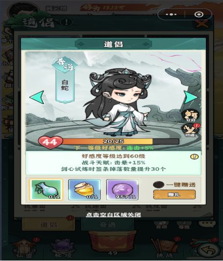 道侣功能开放后可以直接解锁一个道侣,这个直接解锁,把好感度道具全部赠送就行了,可以增加大量战斗力,同时还有额外的特殊效果,升完级后记得切磋哦,还可以获得奖励