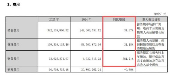2025年,公司销售费用、管理费用、财务费用增长明显,其中销售费用3.42亿元,同比增长37.37%,公司称主要系市场推广费用、电商平台费用及销售人员薪酬增长所致;管理费用1.1亿元,同比增长31.18%,公司称系人员薪酬、折旧摊销费用以及咨询费用增加所致。