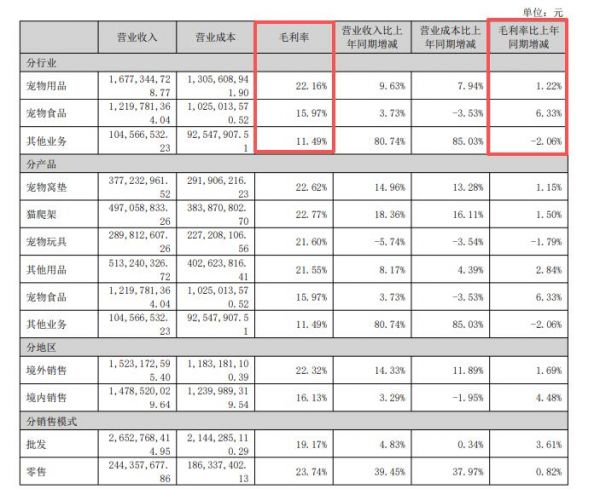 宠物食品和宠物用品的营收占比分别为40.64%和55.88%,毛利率同比分别提升6.33个百分点和1.22个百分点。