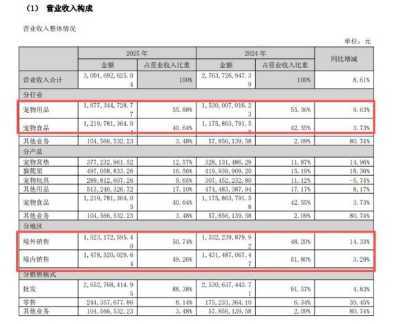公司在年报中表示,随着全球宠物拥有率的持续提高、宠物食品销售的扩大、健康福利行业的深化发展以及人性化养宠趋势的不可逆转,宠物已从单纯的“动物伴侣”升级为家庭中重要的情感成员,这一根本性转变驱动了消费场景的扩展与消费层级的提升。