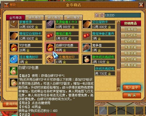 1. 在商城中的金币商店的热销商品内可以购买到白银VIP包裹。