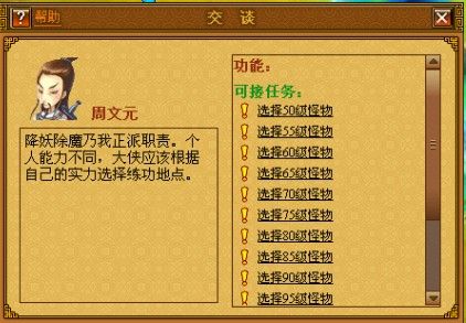 先选择所要击杀的怪物等级,然后与周文元对话完成刚才的选择即可。