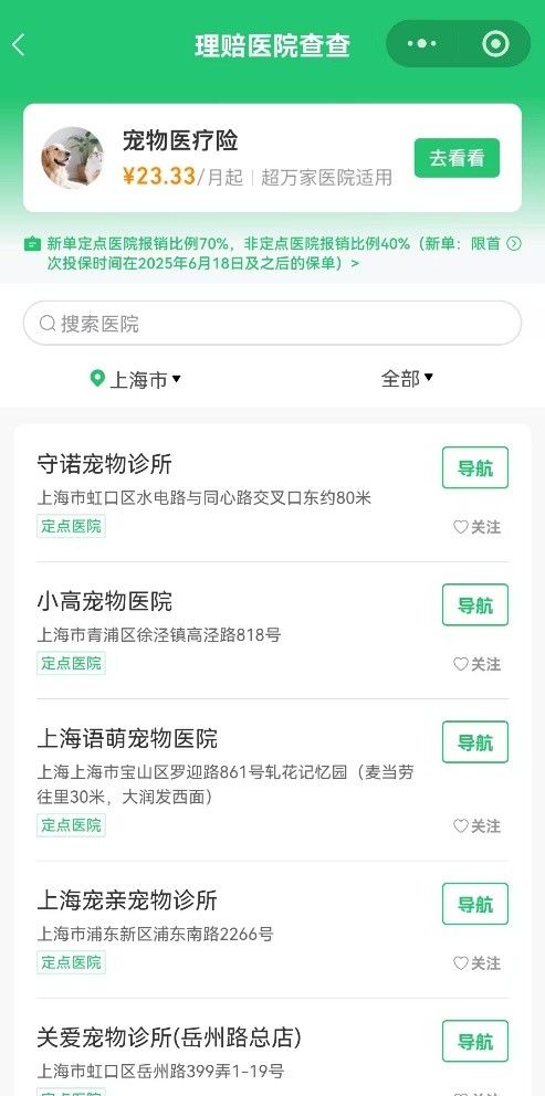 当家里的宠物猫/狗生病了,虽然已经买了宠物医疗险,是不是还会担心能不能顺利理赔?有什么办法可以在去医院前就明确这一点呢?为了解决这个问题,腾讯官方保险代理平台——腾讯微保在小程序内嵌入了一个“理赔医院查查”的工具,可以直观看到家附近可理赔的医院,还能直接导航过去。