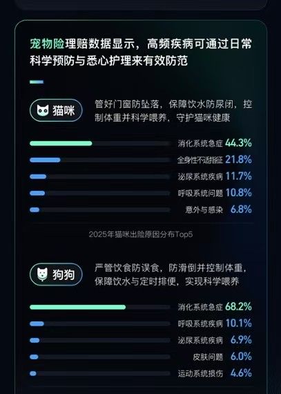 据腾讯微保2025理赔服务年报,2025年平台宠物险理赔案件中,猫咪和狗狗理赔最多的疾病都是消化系统急症,在猫咪理赔案件中的占比是44.3%、狗狗中占比68.2%,其次比较高发的是泌尿系统疾病、呼吸系统疾病及皮肤问题。而根据宠物行业报告,7岁以上的猫狗,心脏病、肾衰竭和肿瘤发病率会明显上升。根据宠物主真实理赔经验,在三四线城市,猫狗一次普通的肠胃炎,检查费、药费、留置观察等就要花3000多元。宠物主可根据自家宠物年龄、日常健康状况、有无既往病史等投保和选择适合的版本。