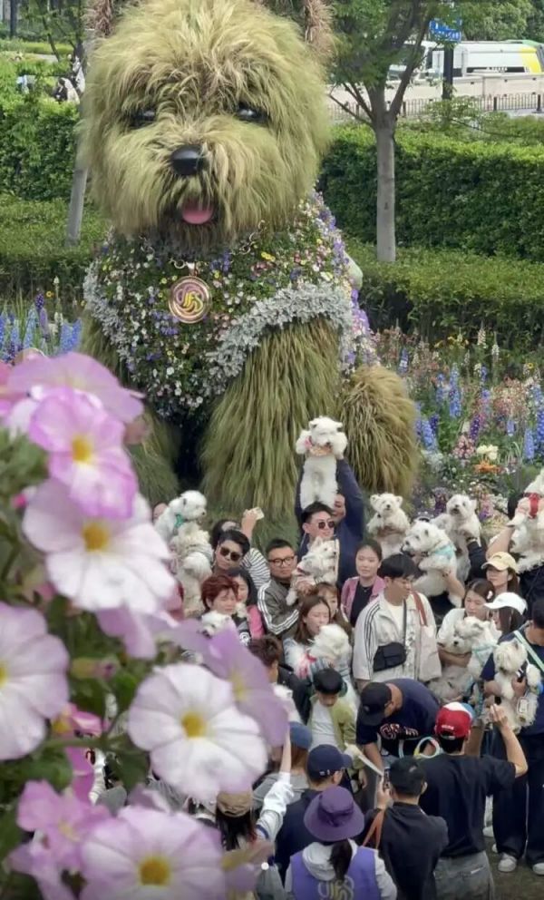 而今天,苏河湾出现了最具画面感的一幕,101只西高地犬集体奔赴现场,与网红“植物西高地”梦幻联动。这场由宠物爱好者自发组织的主题打卡活动,让全网刷屏的“潦草小狗”迎来最忠实的 “粉丝天团”。主人牵着自家西高地,在巨型花艺萌宠前合影留念,真狗与“植物狗”同框,可爱值瞬间拉满,成为花卉节最出圈的名场面。还有不少市民虽然不养西高地,但也专程带着爱宠前来,他们笑着说“带自家毛孩子来见网红前辈”,治愈的画面吸引无数游客驻足拍摄。