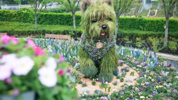 在静安苏河湾万象天地,远远就能望见5.2米高的“潦草小狗”。这是一座巨型宠物主题绿植雕塑,设计师在西高地犬造型上种植了大量绿植,营造出毛茸茸的感觉,“小狗”“穿”着花坎肩,矗立在花丛中。