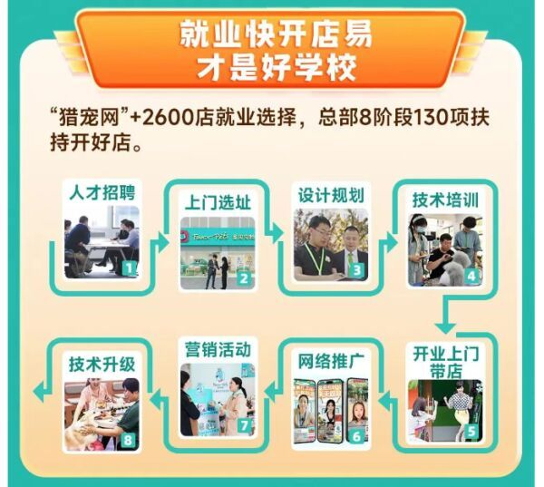 不管你是宠物行业新手,还是无创业经验,圣宠打造8大阶段130项扶持体系,一对一全程帮扶,解决开店全难题: