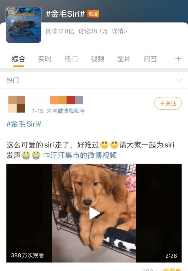 随后,不少宠物博主、网友发文声援。截至发稿,“金毛Siri”的话题在微博上的讨论次数已超过38万。