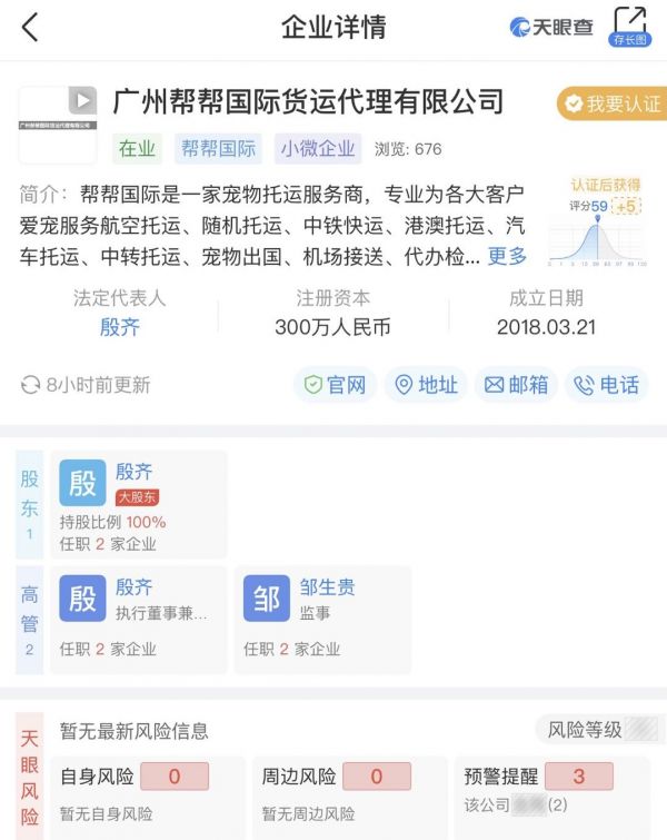天眼查APP显示,广州帮帮国际货运代理有限公司成立于2018年3月,经营范围含宠物用品批发;宠物用品零售;宠物美容服务(不含寄养、销售)等,法定代表人殷齐。