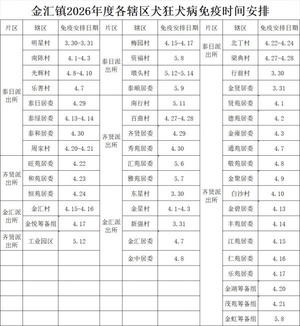 据了解,今年金汇镇将村委会、居委会(筹备组)、工业园区分成三组安排接种时间,有序地开展犬类集中免疫工作。”本轮接种自三月下旬启动,预计持续至五月中旬结束。