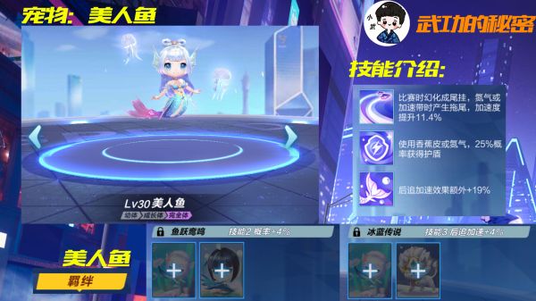 美人鱼作为第3期荣耀勋章宠物。可能有的人以为三技能才是这只宠物的核心,却不知这只宠物的真实定位是更加偏向于道具模式。香蕉皮与氮气这种道具一般领跑位置的拾取概率更高,而通过拾取这辆种道具获得的护盾也充分保护了领跑位置的安全。三技能不错的后追效果也使得在道具模式中有着不错的补位效果。