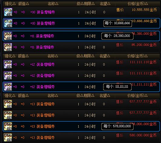 【17】各种增幅券,+10增幅券,1000万;+11增幅券,2900万;+12增幅券,1.1亿;+13增幅券,5.7亿!这应该是近年来+12增幅券最便宜的一次了哇,以前都需要1.5亿左右,现在1.1亿就可以搞定!