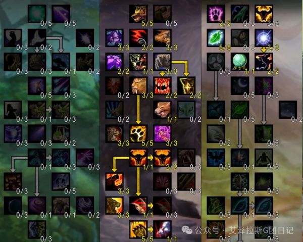 对于天赋配置,主流点法是野性专精55点,恢复16点。恢复系必出清晰预兆与变形大师,野性系则需强化兽群领袖,团队成员暴击可回复4%生命值,同时为熊T恢复8%法力。