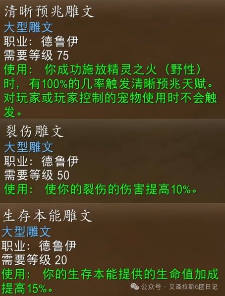 雕文方面,大雕文首选清晰预兆,裂伤与生存本能,小副本或AOE场景可换重殴雕文。小雕文固定无忧复生,荆棘与疾奔。