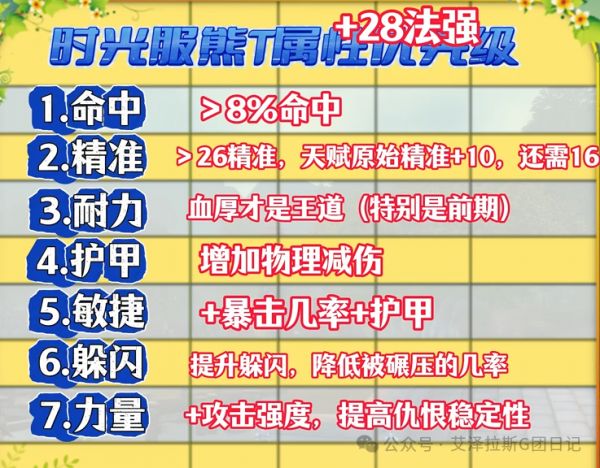 属性层面,命中和精准必须优先达标。前期无脑堆耐力和护甲,其次敏捷,后期可转力量与攻强以强化输出仇恨。
