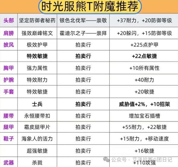 宝石插法若放弃插槽奖励则全耐力,追求属性最大化则选红色狡诈曙光猫眼石,黄色鲜艳森林翡翠或坚硬森林翡翠,蓝色质朴天蓝石或卡尔玛的恩赐,多彩用质朴之大地侵钻石。附魔以耐力,敏捷,护甲为主,具体可参考附魔表格。专业首推珠宝加工,可装备三颗专属高耐力宝石。