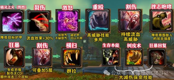 兽群卫士务必点满,直接提升熊形态6%攻强与12%减伤。若追求极致仇恨与功能性,推荐舍弃恢复系的五点变形天赋,改点强化裂伤与感染伤口,使裂伤冷却缩短1.5秒,且撕碎,重殴与裂伤可降低目标50%移速与20%攻速。