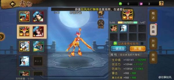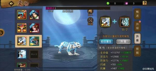宠物在升星时,需要吞噬同名同品质宠物,星级越高,需要吞噬的同名宠物数量越多。这里需要解释一下,为什么需要吞噬同名宠物,拿橙色宠物:麒麟、白虎、雷雀为例,麒麟加命中,白虎加闪避,雷雀加暴击属性,因此必须同名吞噬升星,而不是同品质吞噬。