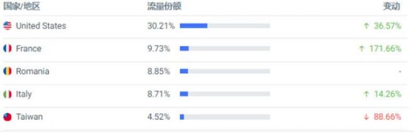 排在美国之后的国家依次是法国、罗马尼亚和意大利,访问量占比分别为30.21%、9.73%、8.85%、8.71%。