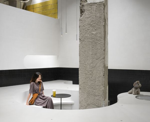 咖啡区整体抬高,而用餐位置是两个下沉的弧线区域。这个高差形成了一个有趣的视觉联系,当宠物在抬高区域而人在下沉区域时,视线高度是相近的。宠物在两个下沉弧线区域之间可以自由穿行。
