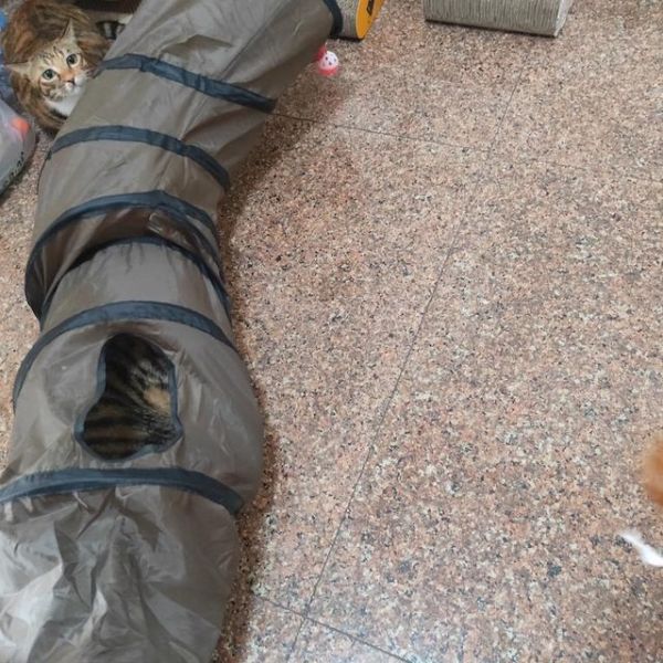 自从在客厅单独开辟了一个空间给猫咪放玩具后,隧道就经常已一种扭曲的形状摆放着,想要去摆正一下的时候才会发现里面躲着一只猫。现在算是完全能够分辨了,把隧道玩得哗哗响并且到处跑的是鱼鱼,而静静的躺在隧道里面,你不走过去都不会发现里面有猫的是年年。不过,还是不得不说,你们这些小猫咪,玩个玩具都花样真多。