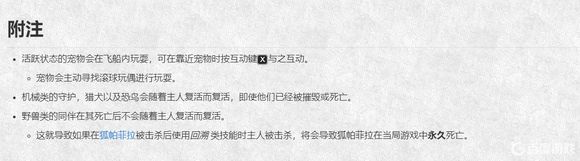 活跃状态的宠物会在飞船内玩耍,可在靠近宠物时按互动键X与之互动。宠物会主动寻找滚球玩偶进行玩耍。机械类的守护,猎犬以及恐鸟会随着主人复活而复活,即使他们已经被摧毁或死亡。野兽类的同伴在其死亡后不会随着主人复活而复活。这就导致如果在狐帕菲拉被击杀后使用回溯 类技能时主人被击杀,将会导致狐帕菲拉在当局游戏中永久死亡。