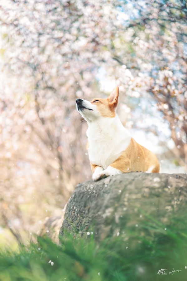 如果想要拍摄树上的花,但是宠物又没有那么高,怎么办呢?可以借助石台等场景来创造一个仰拍的视角。比如下图这样的视角,小柯基也能和树上的樱花同框啦。