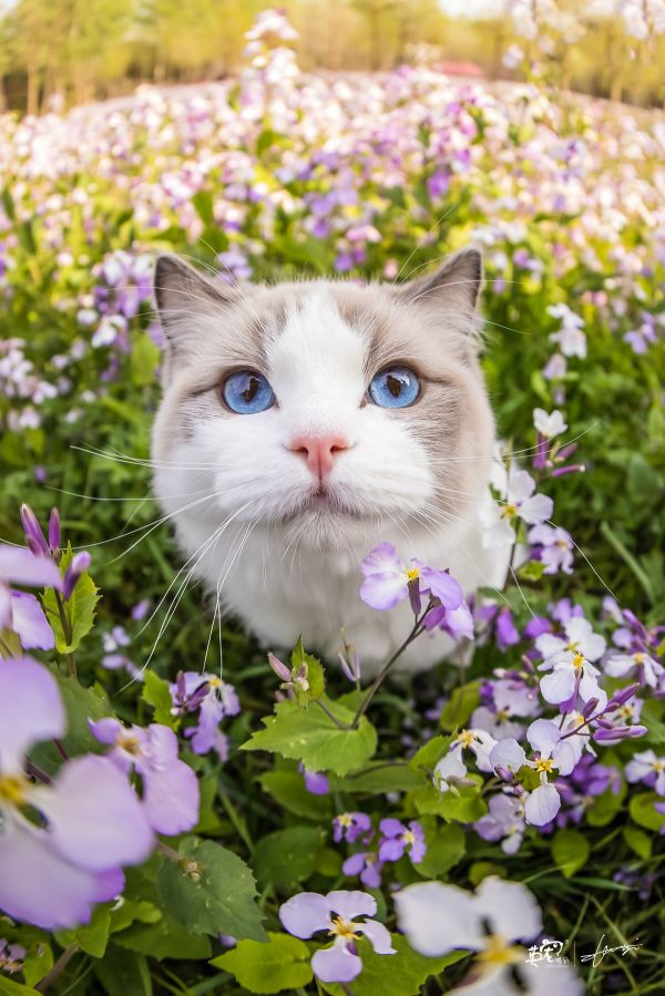 可以找寻符合宠物高度的花丛,例如淡紫色的二月兰,初春会成片开放,形成花海效果,将宠物置身其中,春季优美值拉满。拍摄时我们可以放低机位,平视取景。在平视状态下,宠物能自然表现出更多动作,记录这些动作,让普通宠物变得“不普通” 。