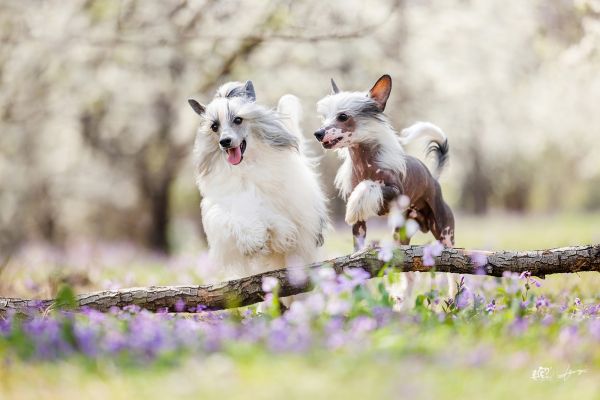 稀疏的花丛也非常适合拍摄宠物奔跑的画面,此时要将机位尽可能地放低。当相机以接近地面的平视角度拍过去,从近到远的花卉都会被“压缩”到画面中,既能带来远近层次感,又不至于拍出光秃秃没有什么花的地面。如果远处再有一些高出的花朵作为背景,那就更完美了。