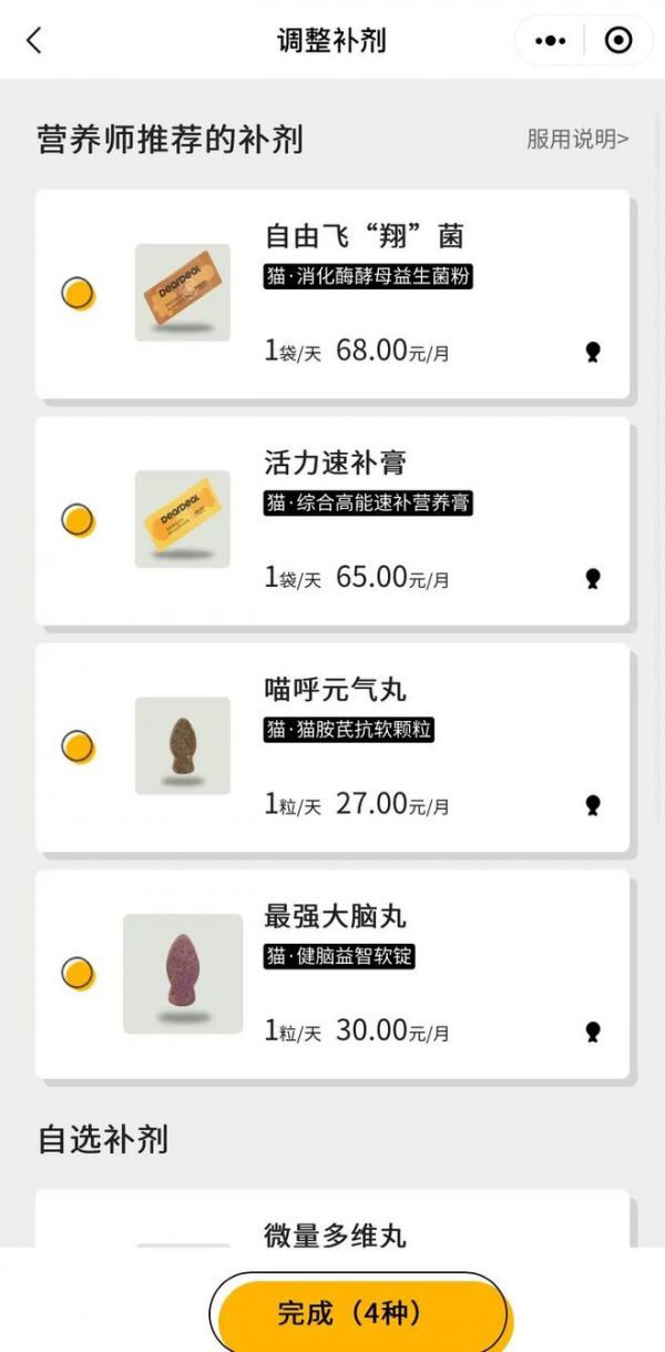 另外还会提供营养补给建议,这里给奶盖推荐了包括益生菌在内的4款营养补剂(名字还是一如既往的有趣)。有营养师推荐的补剂和自选补剂2种,可以根据自己的预算添加或者删减营养品,自主选择性比较强,这点很赞!