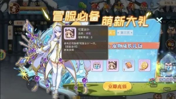 4.可爱女仆,也是一只A级的宠物,是一只攻击类的宠物,可别看他集颜值与属性一体,他比很多S级的宠物都有用,能加高额的双攻属性和暴击率,能大大提高打怪的速度,让他在A级宠物中脱颖而出。获取的方式也很简单,只需要首充6元即可获得。第二天上线就可以获得A级强力战宠。