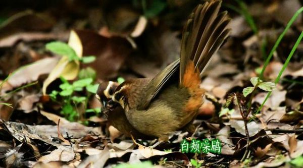 白颊噪鹛喜欢数只一起活动,于是无论在哪里,纵算不鸣叫,动静也很大。有天听见不远的枯叶哗啦啦地响,悄悄凑过去看一看,是两只白颊噪鹛在枯叶中翻翻拣拣,它们专注地找吃食,完全无视站在一旁的我。有趣的是,一只找到了虫子,却衔在口中不吃,另一只赶过来,把虫子接过去自个吃了。它俩又继续翻拣枯叶。