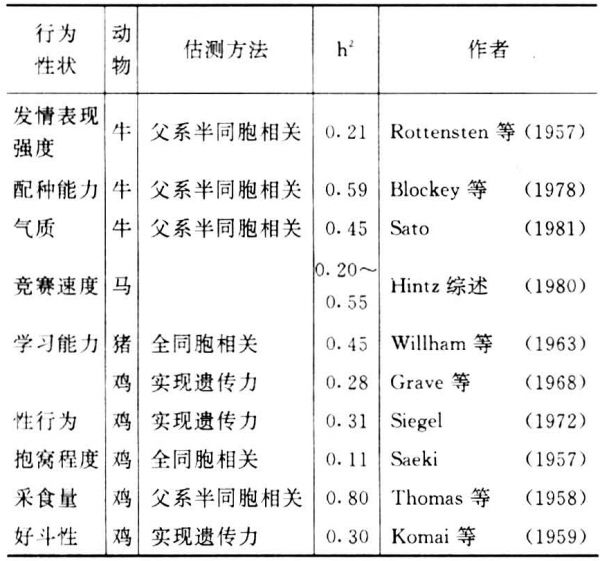 行为性状既受遗传与环境共同影响,因此也可估算遗传力,部分畜禽行为性状的遗传力见表。